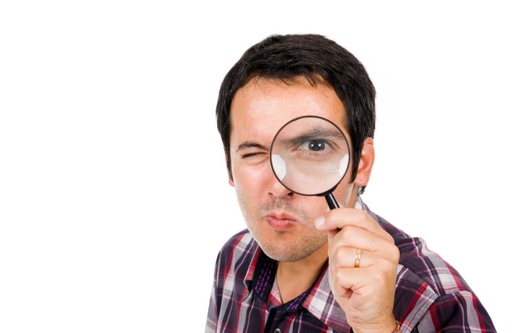 Funny image of a young man looking through magnifying glass, iso
